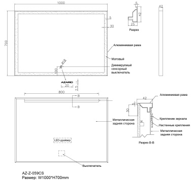 Зеркало AZARIO Alone Raggio 1000х700 влагостойкое с подсветкой, сенсорный выключатель с функцией диммера (CS00078966)